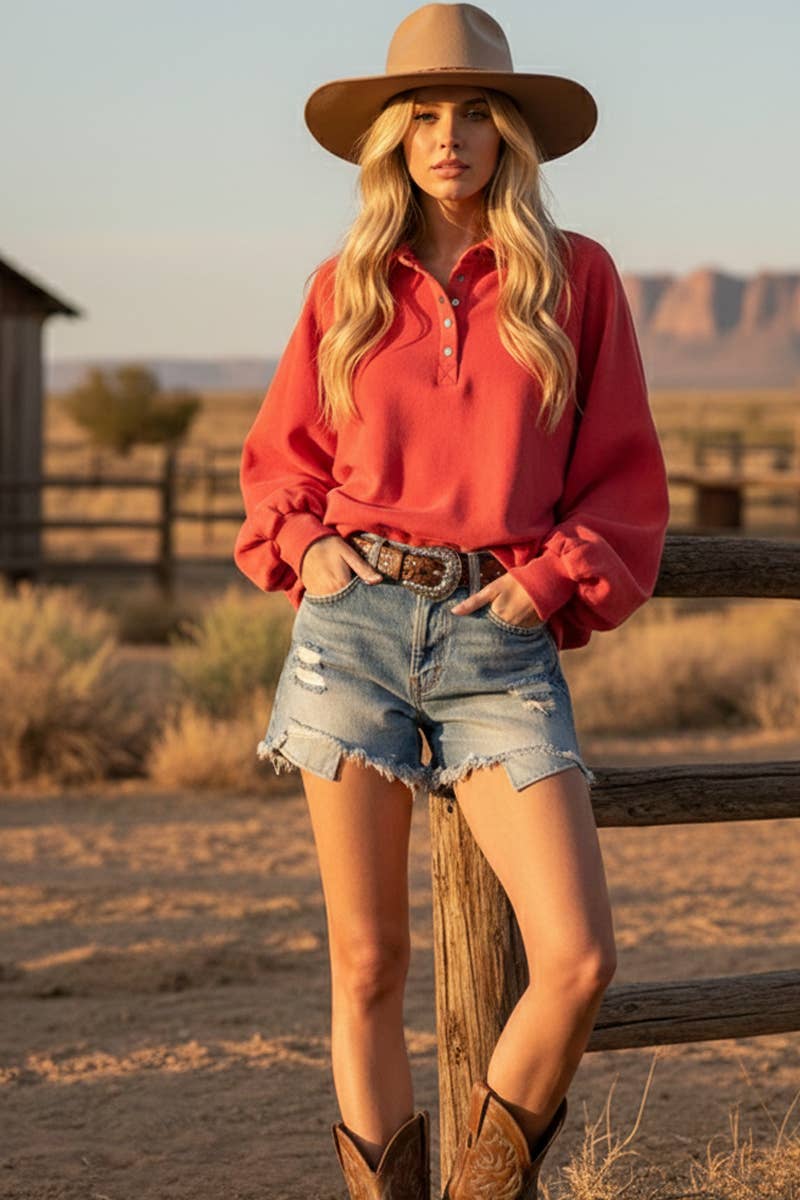 ACID WASH FLEECE BUTTON UP COLLARED PULLOVER