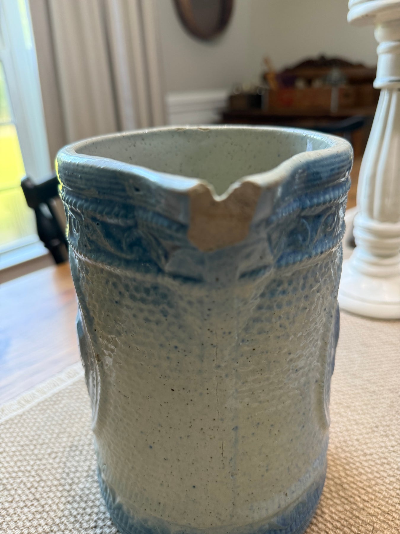 Antique Salt Glaze Pitcher Blue And White Stoneware
