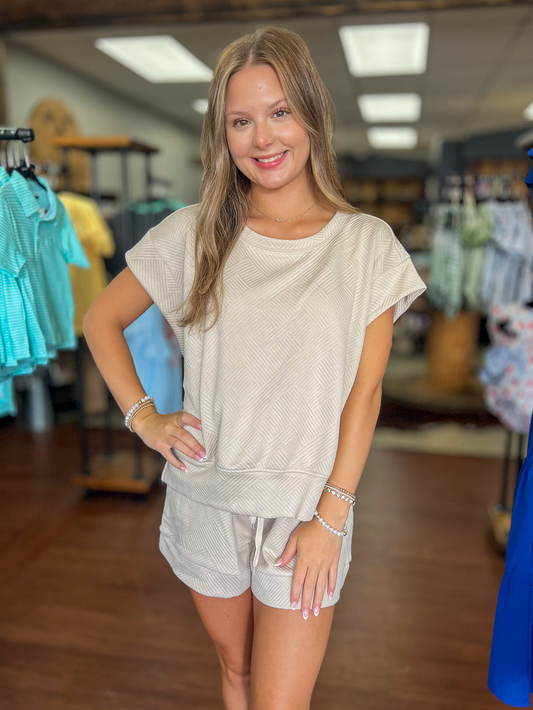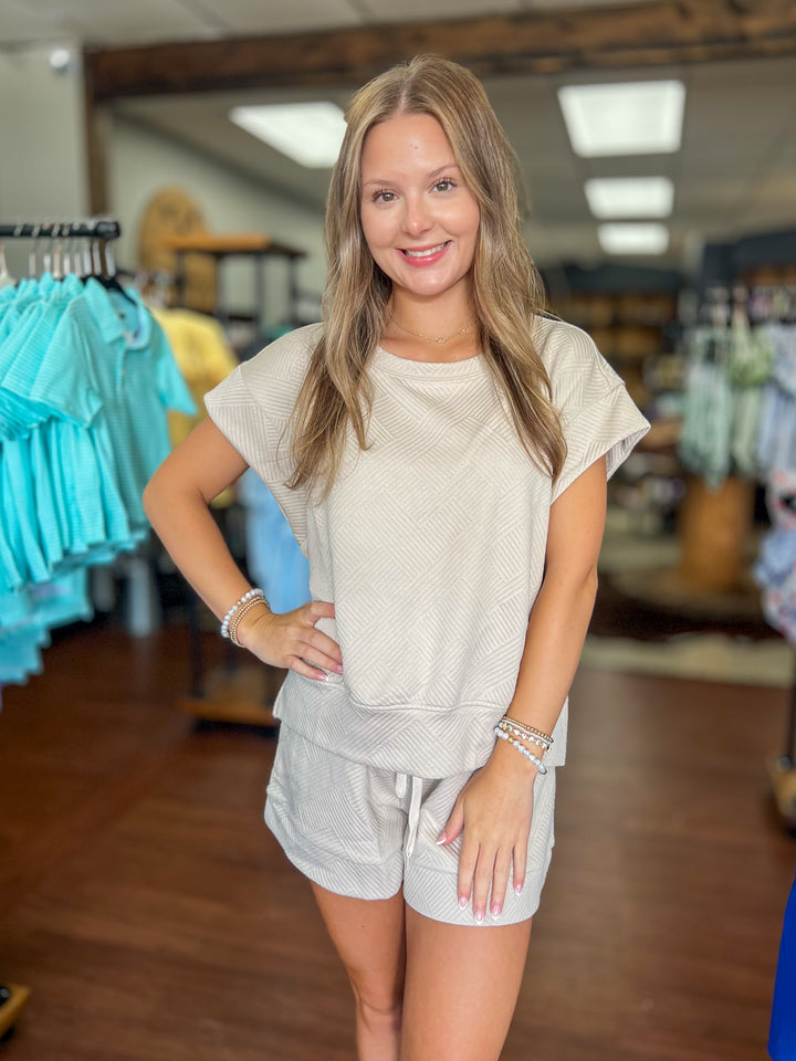 Add a touch of texture to your wardrobe with the Blair Beige Textured Set. Made from a super comfortable fabric, this set takes the guesswork out of matching outfits and can easily be dressed up or down. The shorts feature an elastic drawstring waist for a customizable fit.