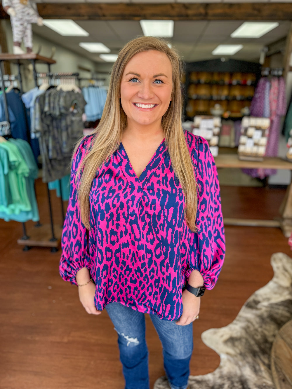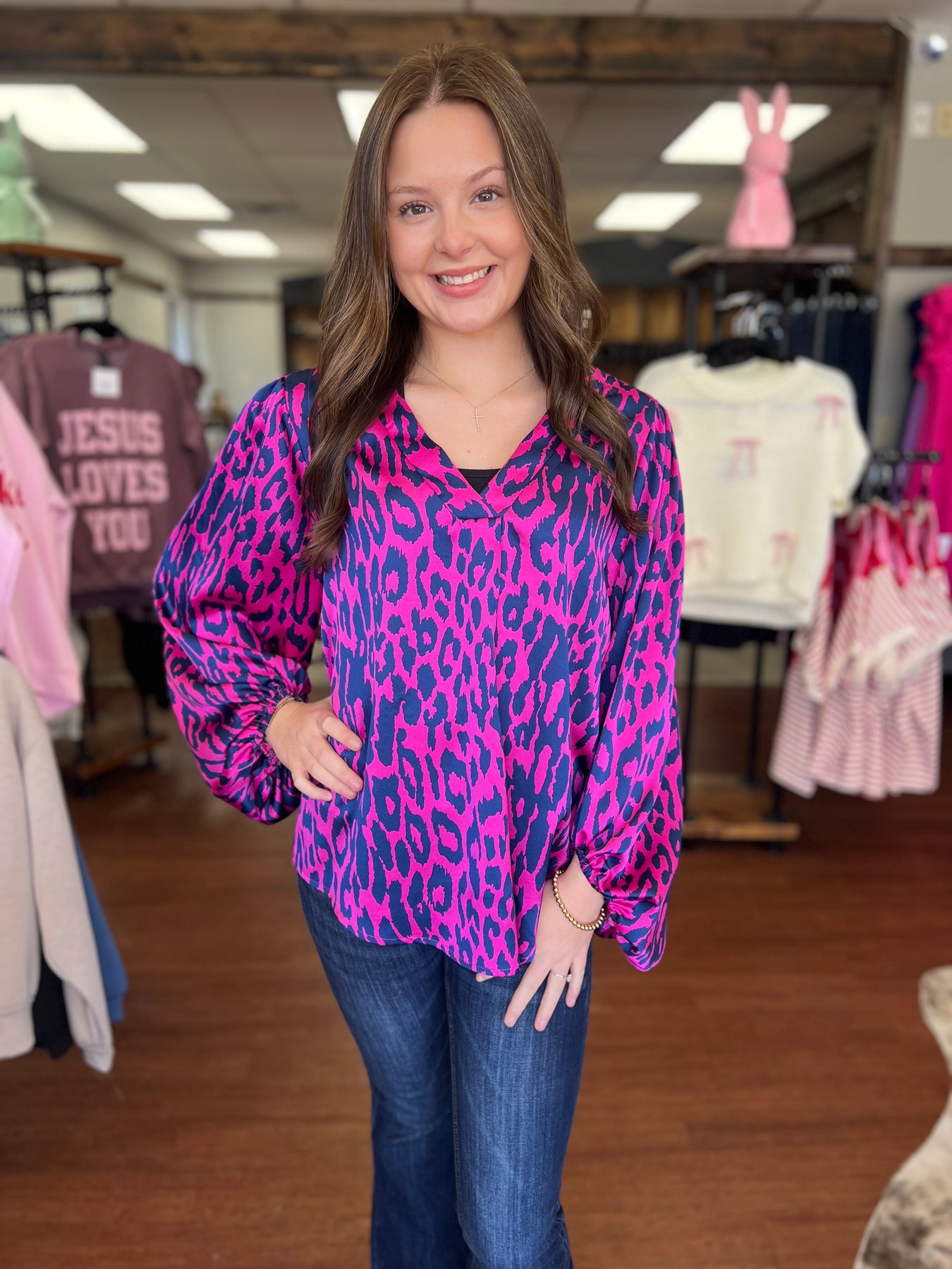 The Violet Leopard Top offers a versatile and stylish addition to any wardrobe. Made of silky polyester material with a pleated v-neck design and a flattering flowy fit, this top can easily be dressed up or down for any occasion. The round hemline adds a touch of sophistication while also running a little big for a comfortable and relaxed look.
